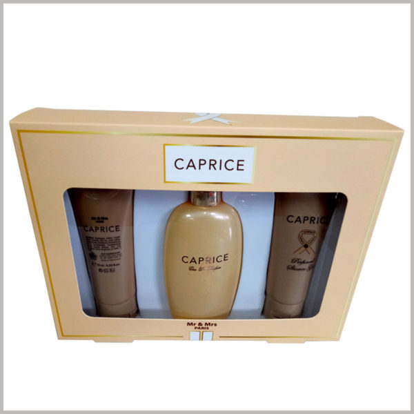 Show you a low-cost shampoo box set that can hold three different toiletries. The packaging box uses 450gsm cardboard paper as the raw material, which reduces the manufacturing cost in terms of materials. Single powder cardboard can be printed improves packaging display effect. The background color of the packaging formed by CMYK printing is the same as the color of the shampoo bottle, which is yellow. On the front of the customized packaging, there is a rectangular transparent window, which can see 80% of the products inside the packaging. Through the PVC window, it was found that the inside of the box was using white blister packaging as an insert to fix three different lotion products. In order to achieve the effect of brand promotion, the brand name of the product is printed directly above the customized packaging window. For more details about other customized shampoo packaging, please feel free to contact us, we know your needs, and provide cost-effective product packaging.