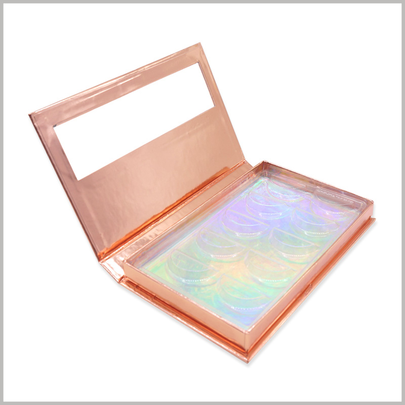 Do you need a pair of eyelashes in a box to quickly sell more false eyelashes? Since most false eyelashes are disposable items, women often need to purchase multiple pairs of false eyelashes at once. According to market demand, we launched 5 pairs of false eyelash packaging. Unlike ordinary foldable false eyelash set packaging, this is a large hard cardboard box. Golden paper is used as a laminated paper to give the entire package a luxurious gold color and make the packaging and products look very high-end. The eyelash boxes use a flip-open form, which belongs to the classic packaging structure design, and it is easy to open the package. On the front of the top cover of the box, a transparent window is formed with 0.2mm pvc. Five pairs of eyelashes can be seen juxtaposed inside the box.