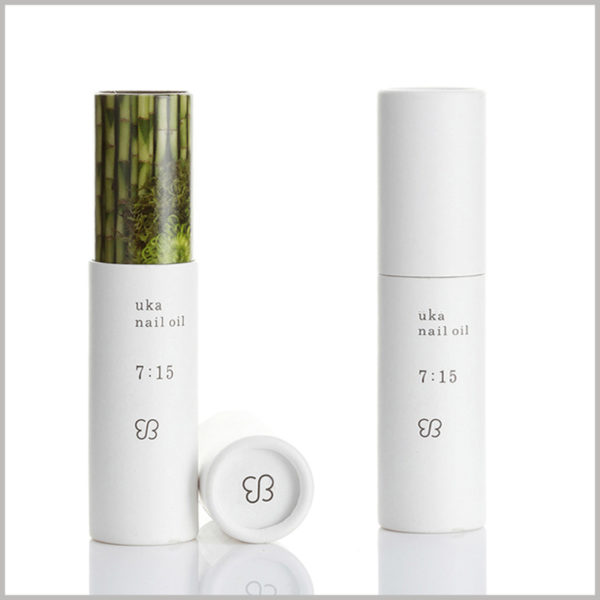 This is a simple design of nail polish packaging, in the form of a small white paper tube. The outer tube of the nail polish is pure white, but the name of the brand nail polish, logo, etc. are printed. However, the inner tube of the paper tube uses paper printed with bright patterns as the laminated paper. It can be found that the pattern of the inner paper tube is unique, attractive, and closely related to the composition of the nail polish, reflecting the characteristics of the product. Since nail polish glass bottles are fragile, the thickness and hardness of the paper tube will be of particular importance. We provide you with a thick cardboard tube with a thickness of more than 1mm, which can withstand the pressure and impact of the outside world and can protect nail polish very well. Since we provide customized cosmetic packaging services, we will provide more packaging solutions according to your actual needs.